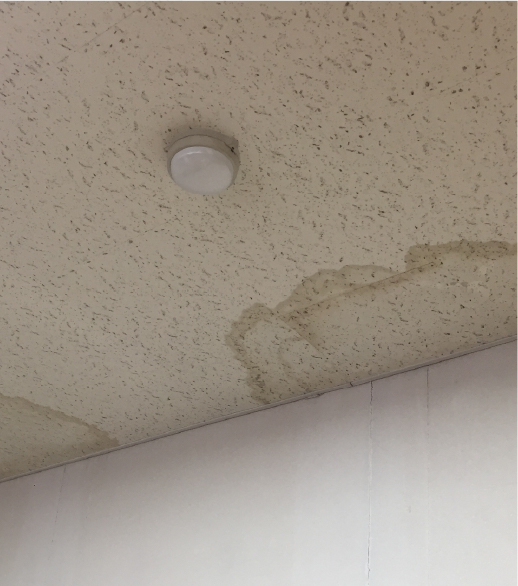 雨どいの割れ、つまり、こう配不良などで、排水がスムーズにできずに、雨漏りが発生。